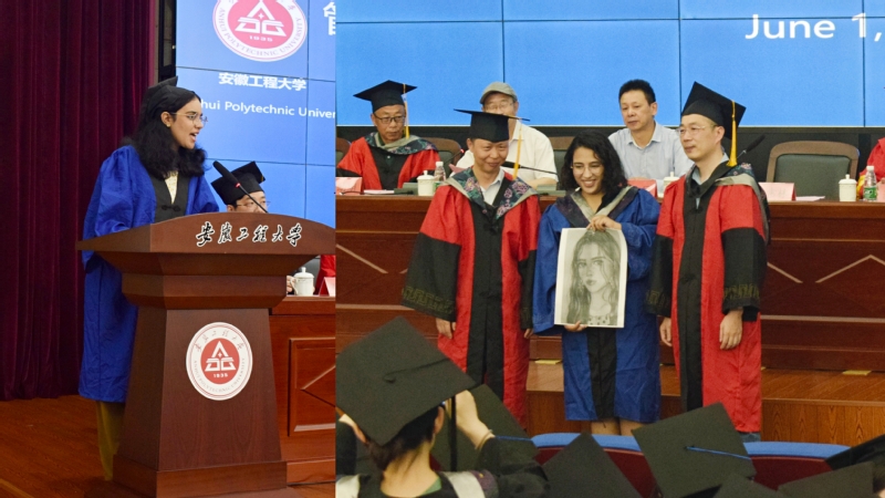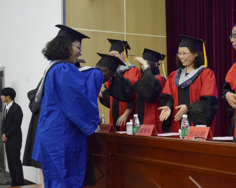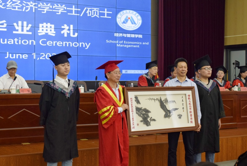 留学研究生代表Chaima向学院赠送了自己获得梅克内斯国际绘画大赛二等奖的画作。学院为全体留学生毕业生赠送了学院标识定制纪念品。