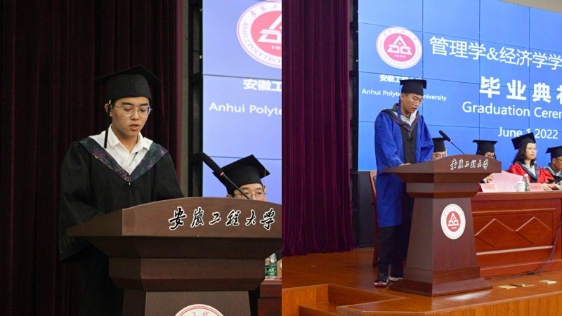 本科毕业生代表章开杨发言:“今后不论奔赴哪里,作为经管人的我们,心中充满着对经管院栽培的感恩。虽然前方的路不再有经管院相作陪伴,但回首来时路,经管院永远在这个路口向我们招手,我们也终将会交出我们的答卷。请母校放心,请学院放心,请老师放心,我们定会不忘初心,牢记使命,砥砺前行,在各自的领域勇攀高峰,努力为安工程代言。”硕士毕业生代表钱甫成表示:“我们将永远记住,我们的事业从这里开始,我们的未来从这里起步,谢谢我最可爱的母校。在未来的日子里,“国家大事,千万尽力”,不论我们身在何处都会怀揣着一份对生活的热爱,牢记青年一代有理想,有本领,有担当,国家有前途,民族就有希望的叮咛和期望,在各自的领域发光发热。”