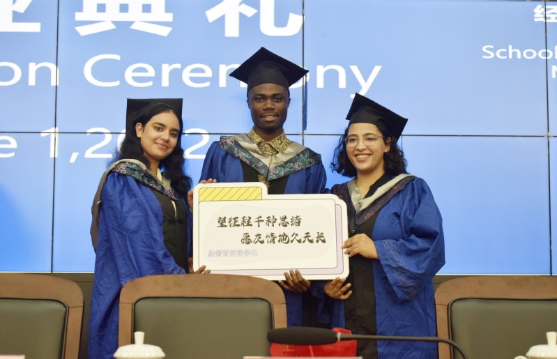 “曾经想征服全世界,到最后回首才发现,这世界滴滴点点全部都是你……”在毕业生离别之际充满感恩与回忆的歌声中,各专业学生代表将他们饱含深情写有最想对母校所说话语的宣传牌举起,典礼在全体同学共情合唱、齐声高喊“经管有我,未来可期,毕业快乐!”中结束。