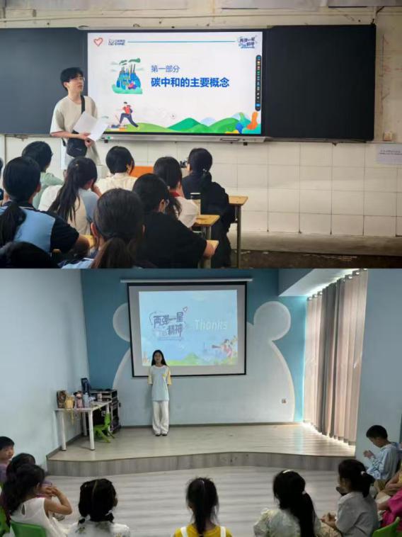 在淮南第四中学、池州市九华山风景区“暑期托管班”、阜阳市临泉县梦·主播艺术中心,服务队联合学院“徽程传承逐梦志愿服务宣讲队”,以“多样化+多维度”为核心教学理念, 开展弘扬“两弹一星”精神主题宣讲活动,通过问答、宣讲、互动游戏等形式,引导青少年坚定理想信念,激发爱国情怀和历史责任感。