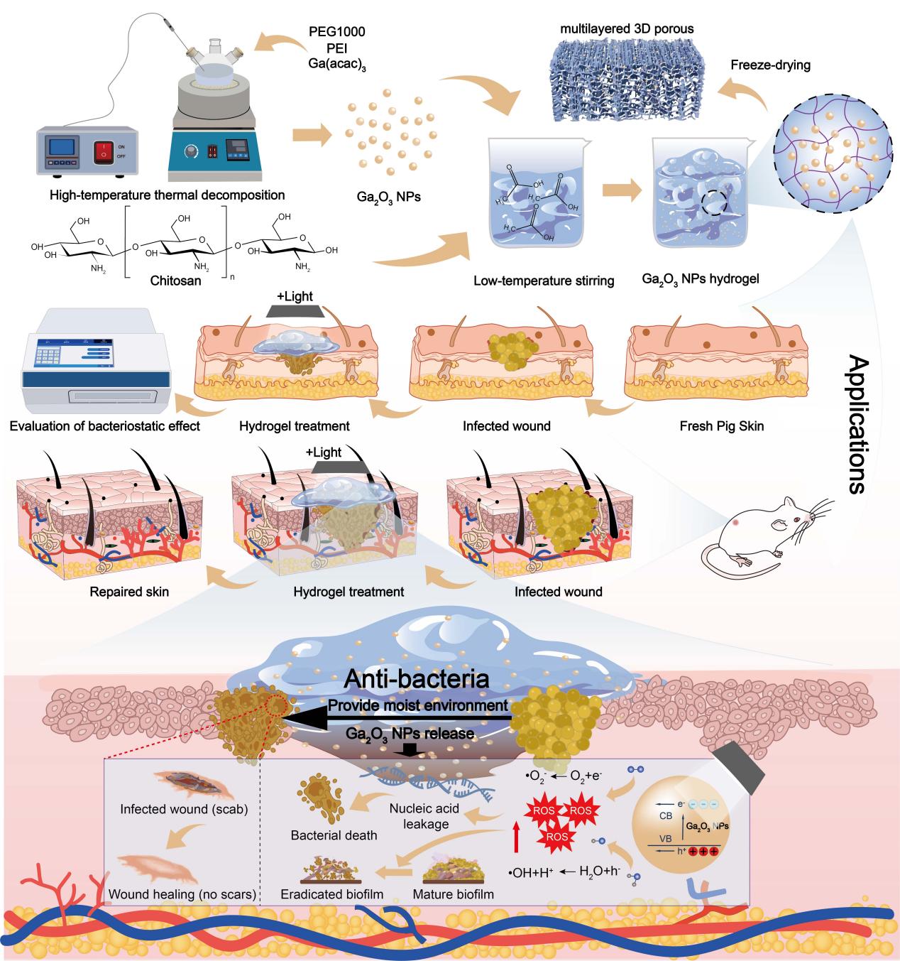 皮肤伤口易受细菌感染,尤其是耐药菌株的感染会显著延缓愈合进程。传统抗生素疗法面临耐药性挑战,而光催化抗菌疗法(PCAT)通过产生活性氧(ROS)杀灭细菌,具有广谱抗菌、不易耐药的优势,且PCAT 利用水分子作为内源性物质,解决了缺氧细菌感染组织产生 ROS 的问题。然而,现有光催化材料在伤口环境中的稳定性、生物相容性及促愈合能力仍需优化。针对这一问题,研究团队通过高温热分解法合成氧化镓纳米颗粒(Ga2O3 NPs),并将其与壳聚糖水凝胶交联,构建了具有多层3D多孔结构的光响应性水凝胶(Ga2O3 NPs hydrogel)。在可见光照射下,Ga2O3 NPs通过光催化作用能够高效产生ROS,破坏细菌细胞膜并诱导核酸泄漏,从而杀灭细菌。此外,水凝胶的湿润环境为伤口愈合提供了理想条件,加速表皮细胞迁移和胶原沉积,显著减少了疤痕形成。